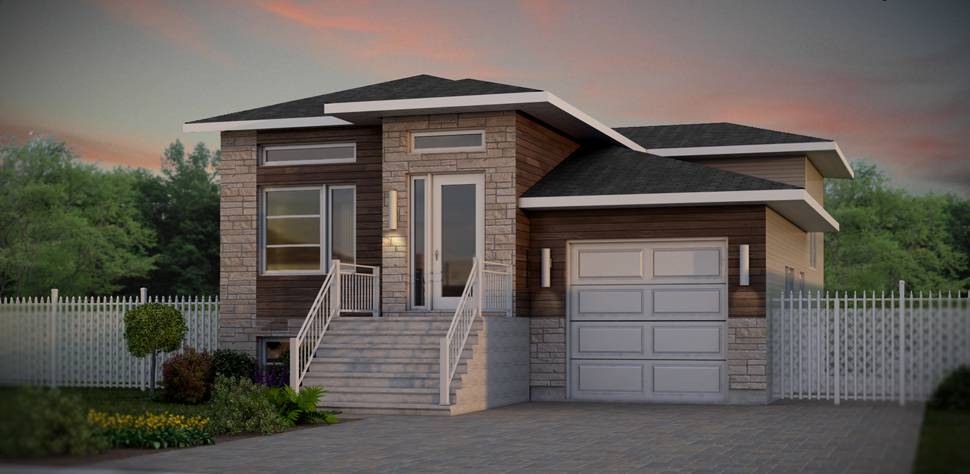 Magnifique bungalow chic et moderne, avec de belles grandes fenêtres tendances et des plafonds de 9 pieds; ce modèle est surprenant. Elle peut être construite en unifamiliale isolé ou avec option logement.
